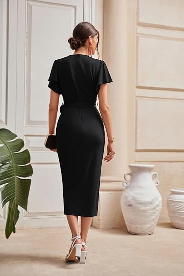 GRACE KARIN 2024 Womens Cocktail Dresses Ruffle Sleeve V Neck Wrap Dress Wedding Party Midi Dress with Belt