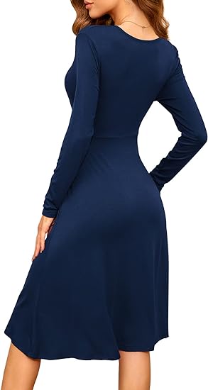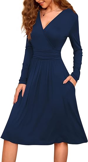 WEACZZY Womens Long Sleeve Deep V-Neck Formal Dress Pleated Waist Knee Length Dresses with Pockets