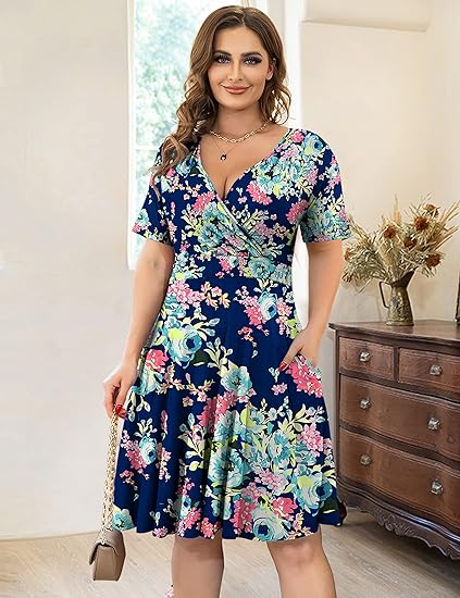 Ahlaray Womens Plus Size Dresses Short Sleeve Faux Wrap Casual Swing Dress with Pockets, L-4XL, embodies comfort and style for curvy figures. This dress features a faux wrap design, adding a trendy touch to the casual swing silhouette. The short sleeves provide a relaxed feel, while the inclusion of pockets enhances practicality. Available in a range of sizes from L to 4XL, Ahlaray caters to a diverse audience, prioritizing inclusivity. Perfect for various occasions, this plus-size dress reflects Ahlaray's commitment to offering fashionable and comfortable choices for all body types.